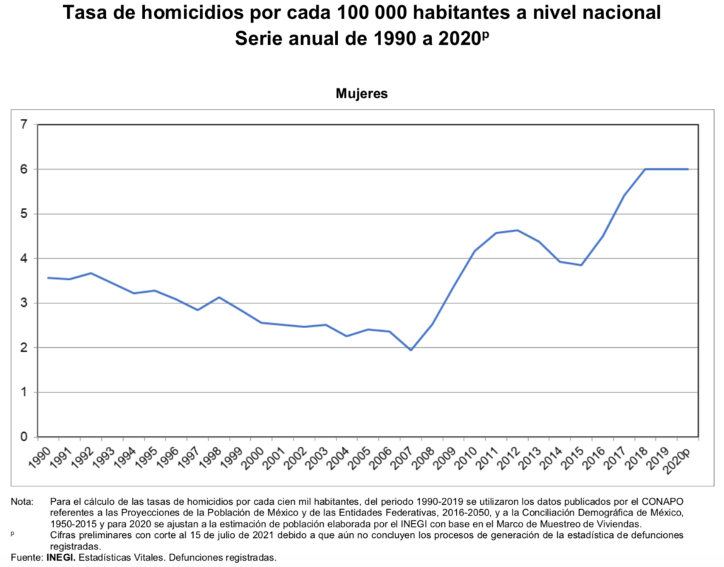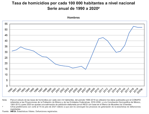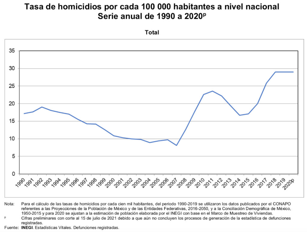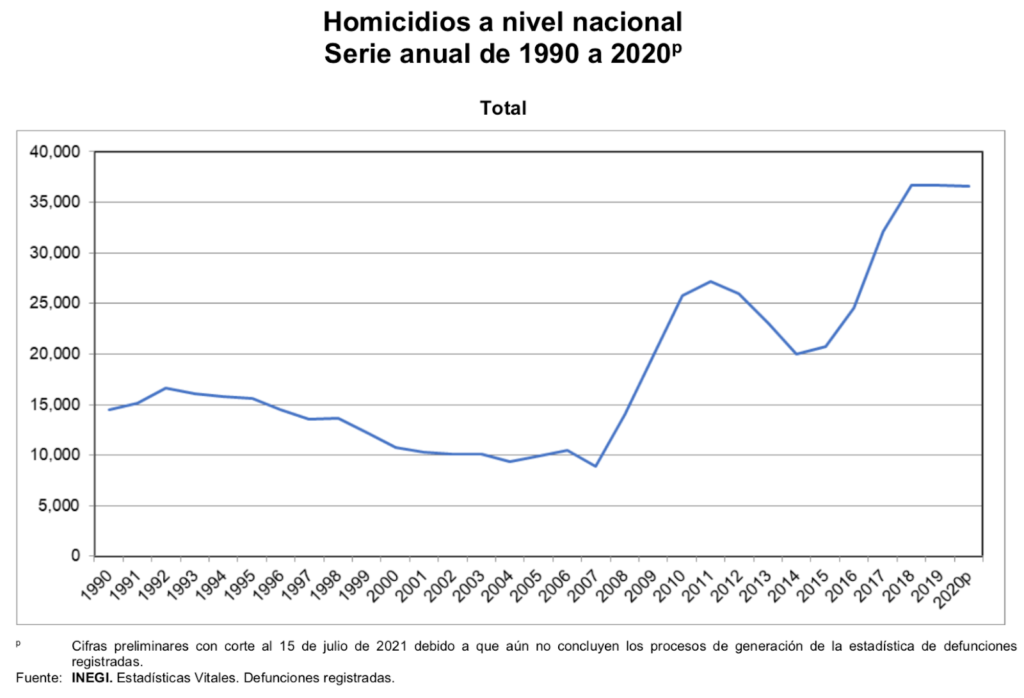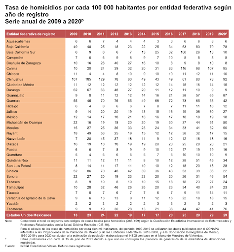 Las estadísticas revelan que en 2020 se registraron 36,579 homicidios en México. Es decir, una razón de 29 homicidios por cada 100 mil habitantes en el ámbito nacional, tasa que es igual a la registrada en 2019. Con la finalidad de facilitar su comparación con la información de años anteriores, se agrega la serie histórica de la estadística definitiva de homicidios de 1990 a 2019.