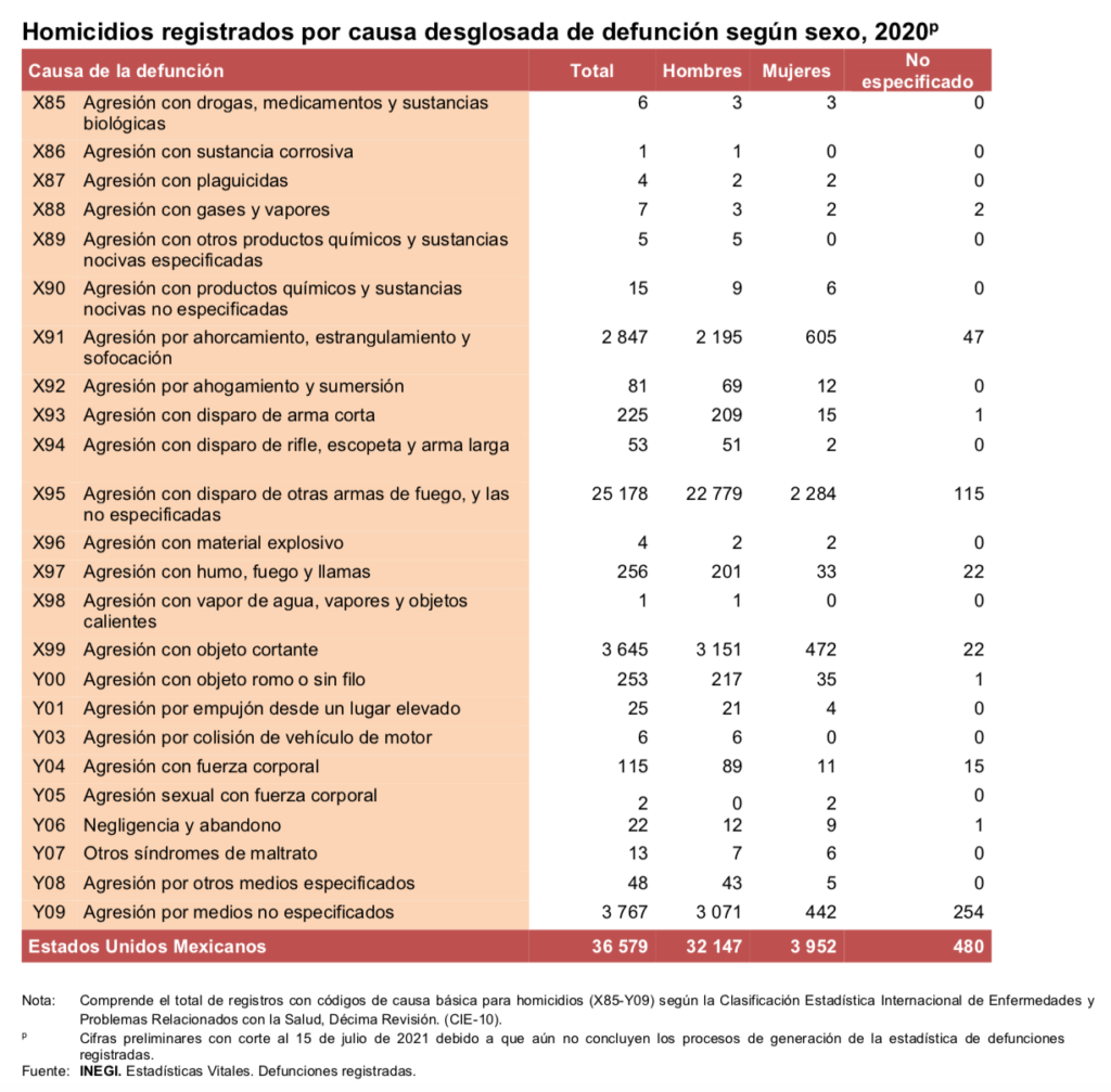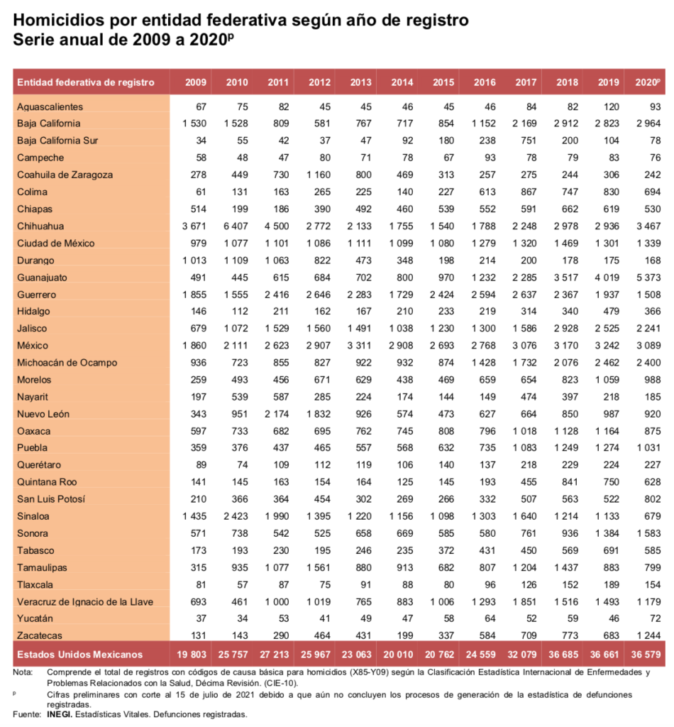 El Instituto Nacional de Estadística y Geografía (Inegi) da a conocer las estadísticas preliminares, a nivel nacional y por entidad federativa, de los homicidios registrados en el país durante 2020.