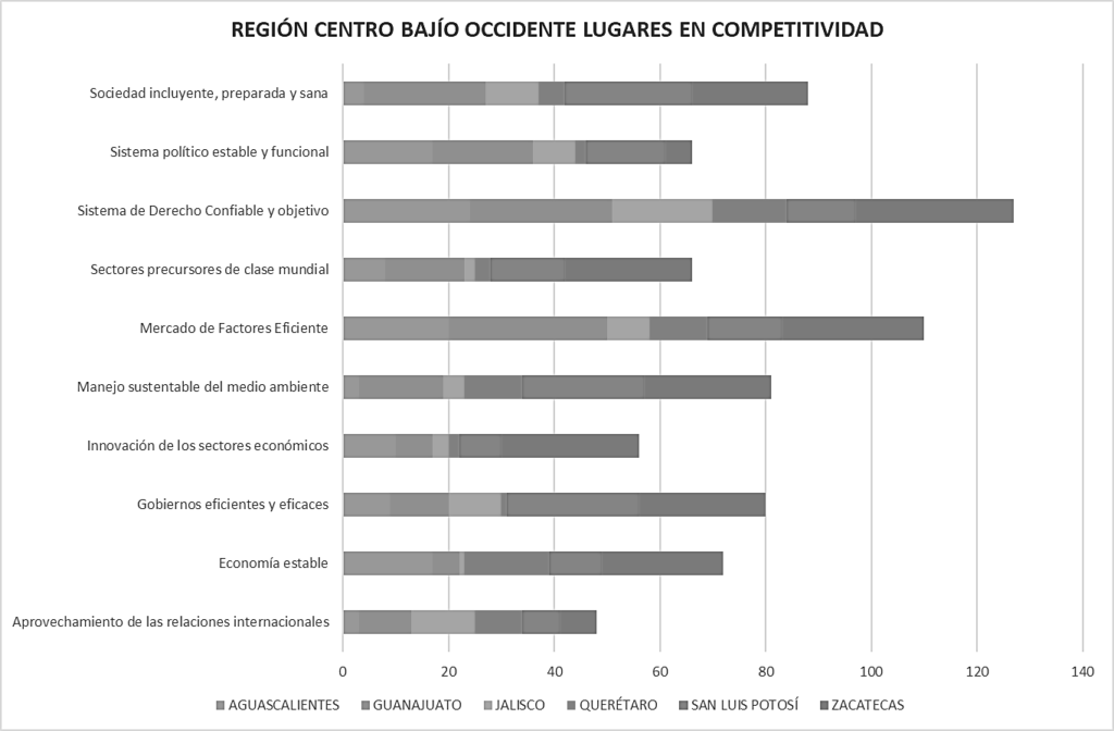 Los estados de la región presentan tres bloques diferenciados: uno conformado por Querétaro, Jalisco y Aguascalientes rankeados en 3° 5° y 6° respectivamente; un segundo bloque conformada por San Luís Potosí y Guanajuato ubicados en los lugares 14 y 17; y un tercero, representado por Zacatecas ubicado en el lugar 25.