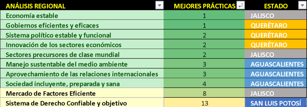 En la Región se presentan varios liderazgos nacionales: es el caso de Jalisco en Economía estable y Sectores precursores de clase mundial; de Querétaro en materia de Gobiernos eficientes y eficaces, Sistema Político estable y funcional e Innovación de los sectores económicos; Aguascalientes destaca en Manejo sustentable del medio ambiente y Aprovechamiento de las relaciones internacionales.