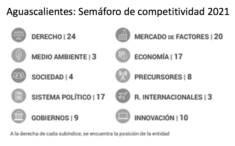 Aguascalientes ostenta diversos lugares: desde un tercer lugar en “Aprovechamiento de las relaciones internacionales” hasta un 24 en “Sistema de derecho confiable y objetivo”.