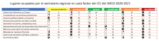 *La Región Centro Bajío Occidente ocupa los mejores lugares en: 1. Aprovechamiento de las relaciones internacionales, 2. Innovación de los sectores económicos, 3. Sistema político estable y funcional y 4. Sectores precursores de clase mundial.