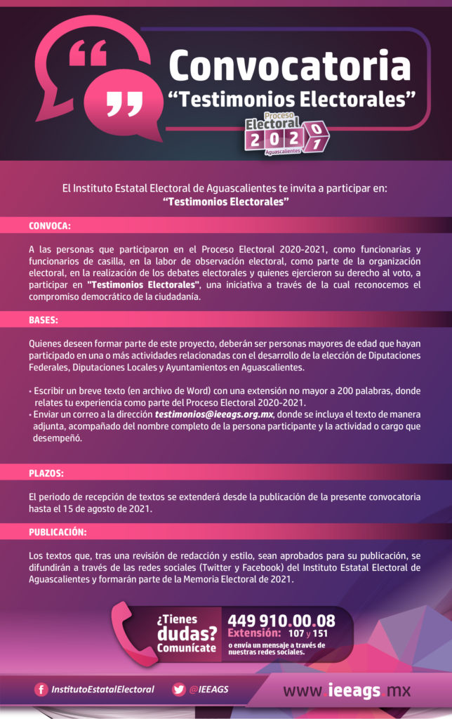 El periodo de recepción de testimonios electorales se extenderá hasta el 15 de agosto de 2021. Los escritos que, tras una revisión de redacción y estilo, sean aprobados para su publicación, se difundirán a través de las cuentas oficiales del IEE en Twitter y Facebook, además de que formarán parte de la Memoria Electoral 2021.