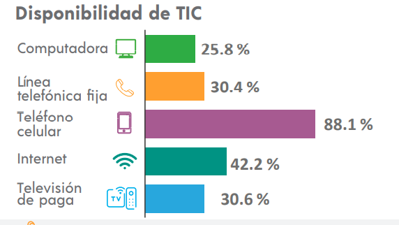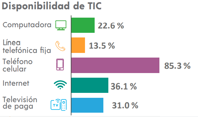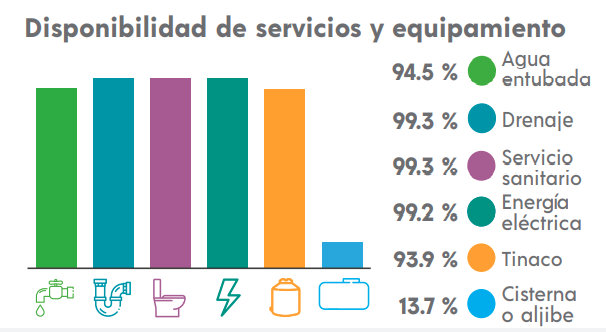 Sobre disponibilidad de bienes, el 88.4% de la población cuenta con refrigerador; 82.3%, con lavadora; 53.0%, con automóvil o camioneta; 25.3, con motocicleta o motoneta; 44.6%, con bicicleta.