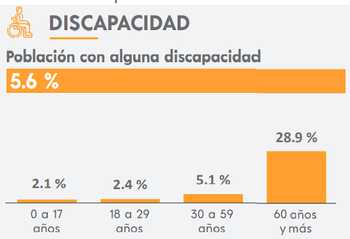 La mayor población en Asientos con alguna discapacidad es la de 60 años y más, con 28.9%.
