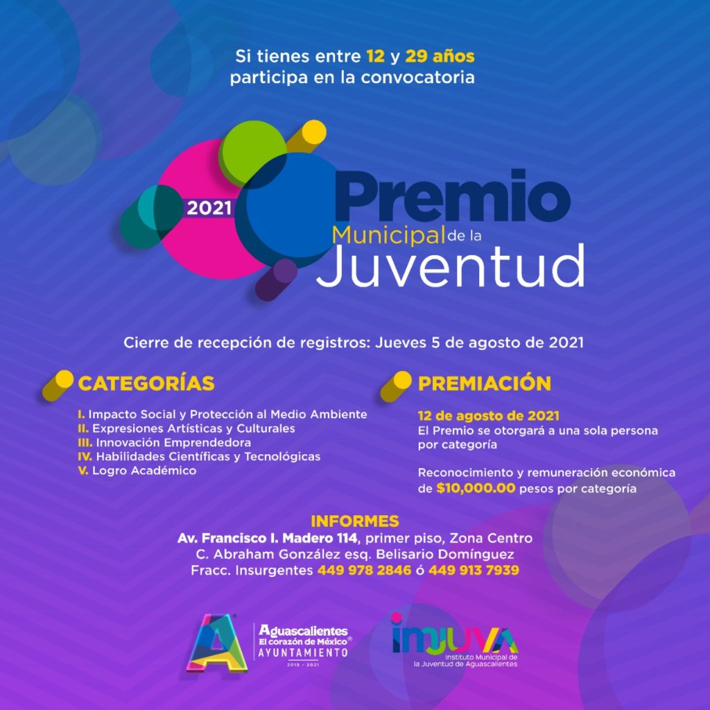 Con el propósito de reconocer a los jóvenes sobresalientes en actividades artísticas, productivas, científicas y tecnológicas, de protección del medio ambiente y académicas, el Ayuntamiento de Aguascalientes invita a participar en la convocatoria del Premio Municipal de la Juventud 2021. Así lo informó Juan Pablo Armendáriz Rodríguez, encargado de despacho del Instituto Municipal de la Juventud de Aguascalientes (Imjuva).