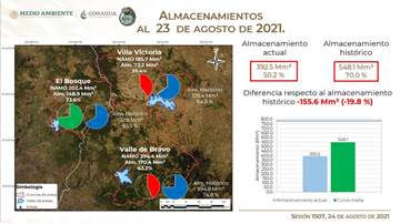 En tanto, del 1 de octubre de 2020 al 22 de agosto de 2021 se ha registrado 3.7% más lluvia que el promedio histórico de ese mismo lapso.