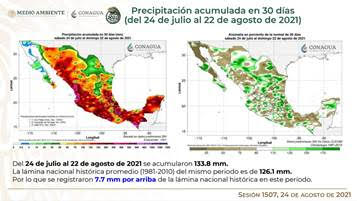 • Del 24 de julio al 22 de agosto de 2021, se registraron 7.7 milímetros más de lluvia que la lámina nacional histórica de este periodo