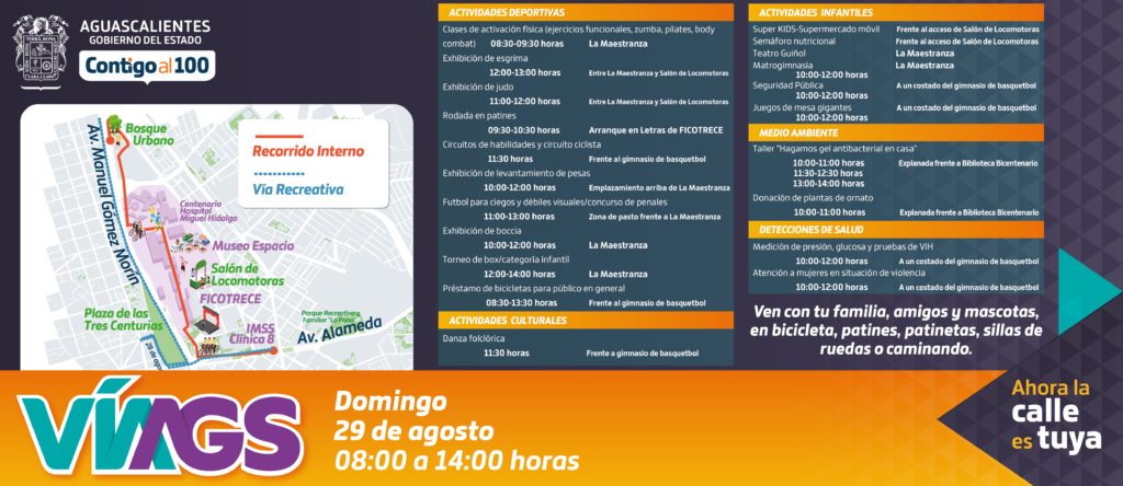 La próxima edición de la Vía Aguascaliente se realizará el próximo domingo 12 de septiembre, de 08:00 a 14:00 horas, con el cierre de las mismas vialidades.
