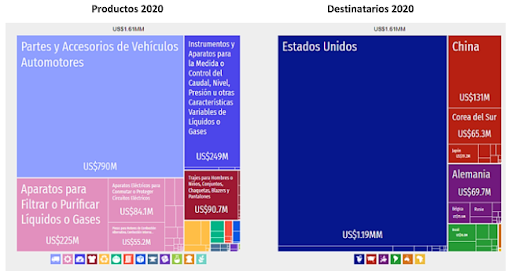 Los principales destinos de ventas internacionales en 2020 fueron Estados Unidos (US$1.19MM), China (US$131M) y Alemania (US$69.7M).