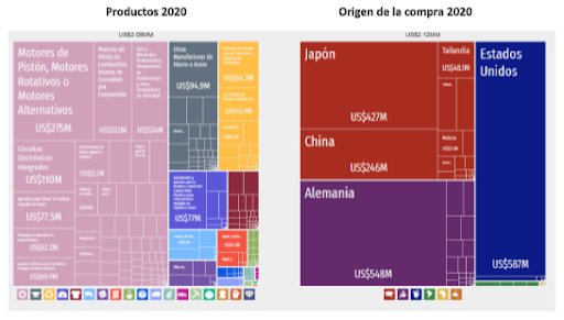 Los principales países de origen de las compras internacionales en 2020 fueron Estados Unidos (US$587M), Alemania (US$548M) y Japón (US$427M).