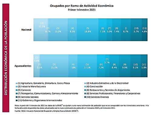 La población ocupada en Aguascalientes en el primer trimestre de 2021 fue 596k personas, siendo superior en 6.32% al trimestre anterior (560k ocupados) y superior en 2.08% respecto al mismo periodo del año anterior (584k ocupados). La tasa de desocupación se encuentra en 3.9% (abajo del promedio nacional de 4.2%).