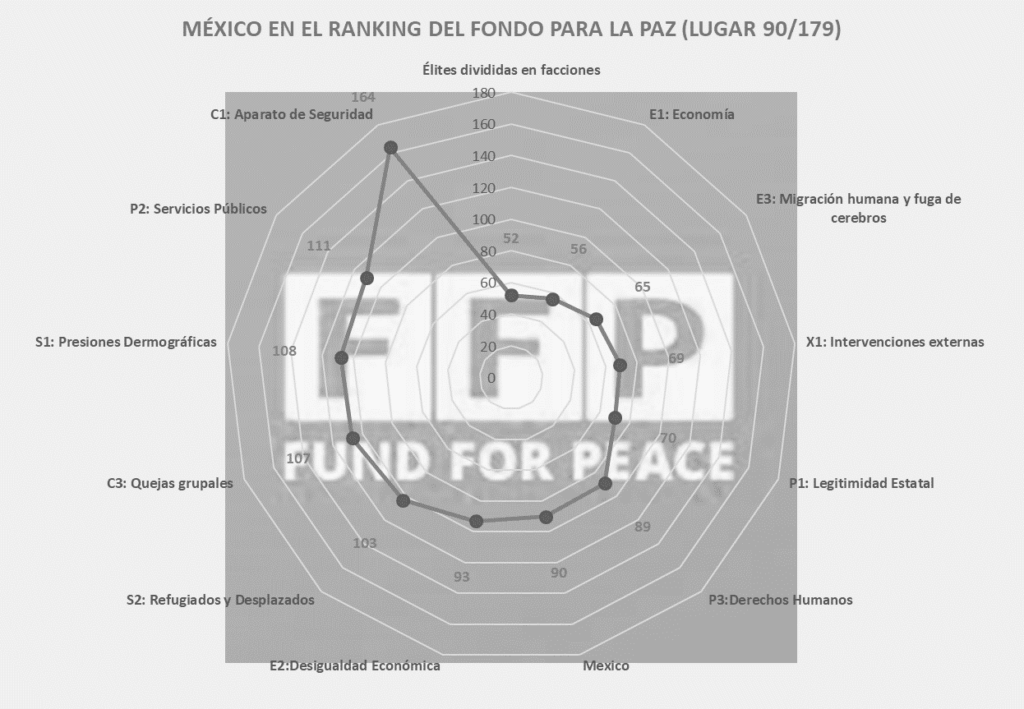 México tiene menor fragilidad en materia de Élites divididas y reclamación grupal (lugar 52) y en materia Económica (56) pero se encuentra muy por debajo en la tabla en el tema de Aparato de Seguridad (164). Aparece por debajo de la media tabla en Derechos Humanos (89), Desigualdad Económica (93), Refugiados y Desplazados (103), Quejas Grupales (107) Presiones Demográficas (108) y en Servicios Públicos (111).