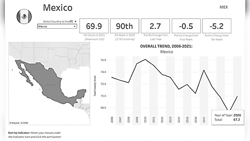 Según el informe, México presenta una calificación de 69.9 puntos de un máximo de fragilidad por 120, lo que significa una peor evaluación respecto al año pasado cuando obtuvo 67.2 puntos, con una variación de menos 0.5 puntos en los últimos cinco años y de menos 5.2 en la última década.