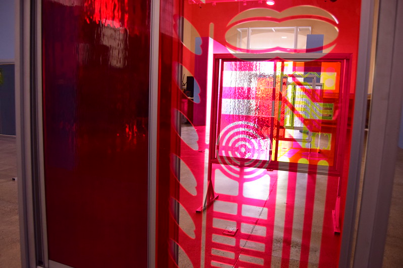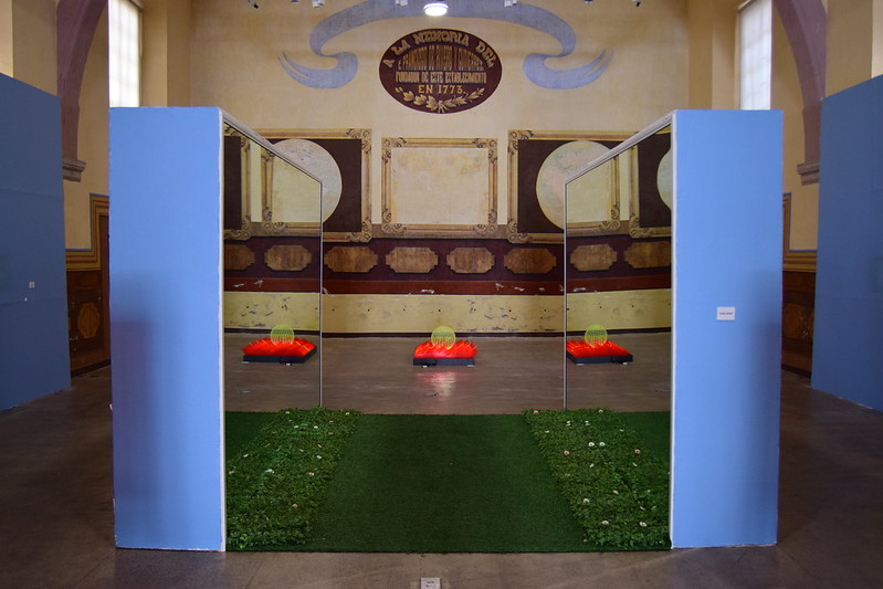 Adriana Flores, quien fuera encargada de la curaduría de la exposición, explica en el texto de sala que “es un espacio híbrido, compuesto por elementos análogos (materiales) que completan su ciclo de vida en su dimensión digital (virtual) valiéndose de efectos ópticos que responden a la sensibilidad de cada usuario.
