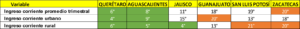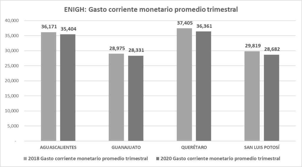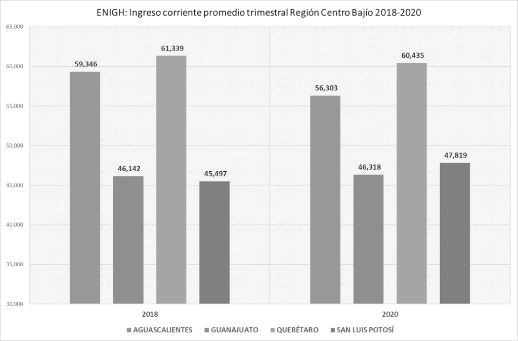 En el vecindario Regional Querétaro (60 mil 435) y Aguascalientes (56 mil 303) presentan un ingreso corriente superior a San Luis Potosí (47 mil 819) y Guanajuato (46 mil 618).