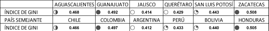 El índice de Gini nos permite conocer si es sana la distribución del ingreso de un estado o país. Así, tenemos mejores distribuciones en los países europeos que en los americanos e índices de Gini ejemplares entre los países nórdicos y de pésima situación tratándose de países africanos. Los estados del vecindario regional se encuentran entre Honduras, (Zacatecas) y Argentina (Jalisco). La situación es mejor en Querétaro y San Luis Potosí con Gini semejante a Perú y Bolivia que la de Aguascalientes, que, si bien cuenta con un índice de Desarrollo Humano alto semejante al de Chile, también presenta un Gini con mala distribución del ingreso como el chileno.