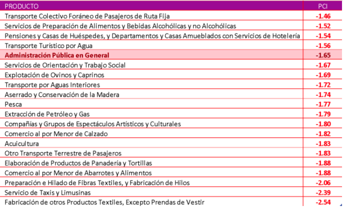 Por otro lado, en la tabla baja tenemos que los 20 productos calificados como más negativos están muy relacionados con los servicios de transporte colectivo, desde terrestre, de pasajeros, local y foráneo, hasta turístico por agua y los taxis. Es notable ver la desfavorable calificación de los rubros del PCI para: la extracción de gas y petróleo, la industria maderera, pesquera y textil. La administración pública en general también exhibe valores adversos.