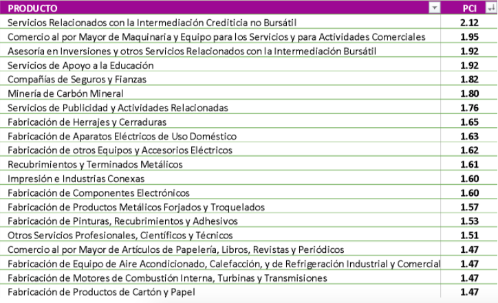 El Índice de Complejidad de Producto (PCI) es un complemento perfecto del ICE, mide la complejidad requerida para desarrollar una actividad económica (industria, producto u ocupación). Su valor se correlaciona con la concentración espacial y los ingresos de las actividades económicas. El PCI puede estimarse con datos de exportaciones, empleo, patentes, etc. por lo que sus valores difieren de acuerdo a los datos y umbrales utilizados. De cerca de 300 productos clasificados por el SCIAN para el país, la mitad se encuentra evaluado por el PCI como negativos.
