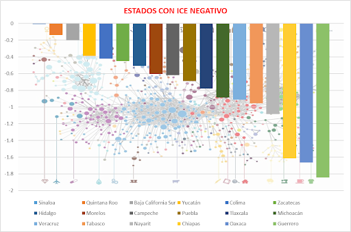 El Índice de Complejidad Económica ECI, puede estimarse usando datos de exportaciones, empleo, patentes, etc., por lo que las estimaciones difieren de acuerdo a los datos y los umbrales utilizados. La visualización muestra la complejidad económica de las entidades federativas de México a mayo de 2021. Trece estados califican con un ICE positivo, por 19 que presentan un índice negativo.