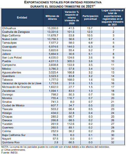 En el segundo trimestre de 2021, los estados que más contribuyeron al valor total de las exportaciones de las entidades federativas fueron Chihuahua con el 13.7%, Coahuila de Zaragoza 12%, Baja California 10.5%, Nuevo León 9.7% y Tamaulipas con 6.8%; en conjunto estos cinco estados aportan el 52.7 por ciento.