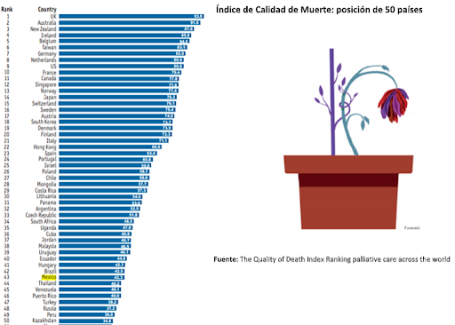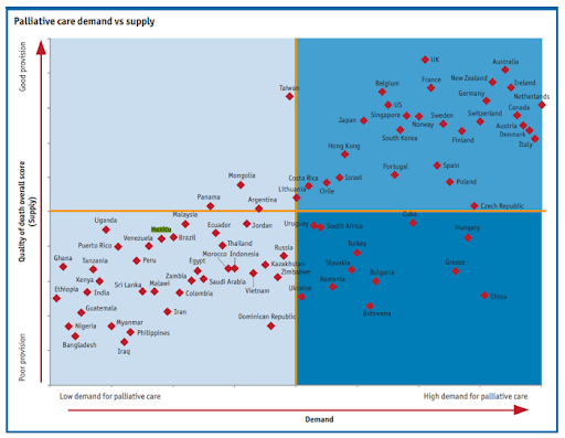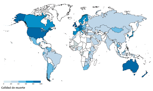 El Índice de Calidad de la Muerte se diseñó y construyó por una Unidad de Inteligencia interdisciplinaria. Todos esperan una buena muerte, o más bien, “una buena vida hasta el final”, pero hasta hace poco, hubo poco esfuerzo e inversión dedicados para proporcionar los recursos y la educación que haría eso posible. El compromiso público y las intervenciones políticas propias para mejorar la calidad de muerte a través de la provisión de alta calidad en los cuidados paliativos han ganado impulso en los últimos años, y algunos países han hecho grandes avances en la mejora de un acceso asequible a los cuidados paliativos. A México lo ubican como un país de baja demanda y de pobres recursos en materia de Cuidados Paliativos, pero países latinoamericanos como Chile y Costa Rica, con niveles altos en Calidad de Vida también se presentan con mayores probabilidades de crecimiento en el índice de Calidad de Muerte, toda vez que cuentan con mayor soporte para proporcionarlos y por ello se encuentran cada vez más demandados.