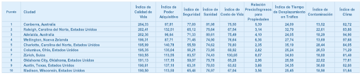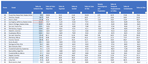 Llama la atención que, con esta metodología, ciudades latinoamericanas como Brasilia, Montevideo, Medellín, Guadalajara, San José de Costa Rica y Monterrey, se encuentre dentro de las 70 ciudades americanas con mayor calidad de vida; lo que significa estar a solo cinco o seis lugares de ciudades como Nueva York o Los Ángeles. Claro, con un poder adquisitivo mucho menor, pero con indicadores semejantes en temas como seguridad y sanidad y con otros francamente mejores como el costo de vida, el precio de las propiedades y no digamos al comparar las bondades del clima…
