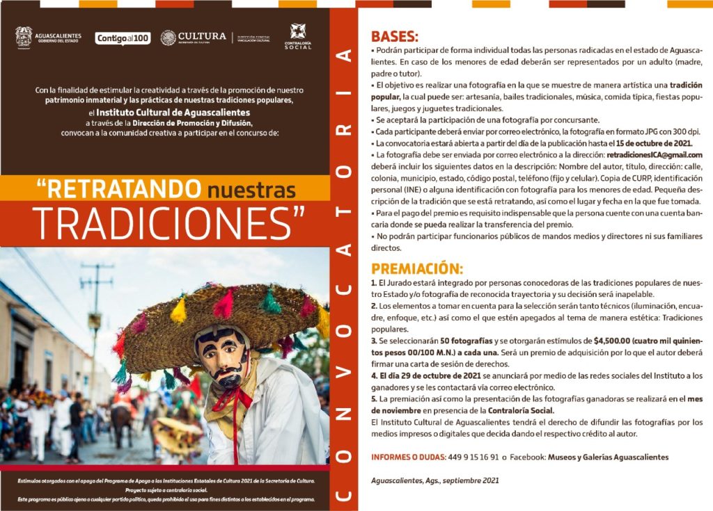 Con la finalidad de estimular la creatividad a través de la promoción de nuestro patrimonio inmaterial y las prácticas de nuestras tradiciones populares, el Instituto Cultural de Aguascalientes (ICA) convoca a la comunidad creativa a participar en el concurso Retratando nuestras tradiciones.