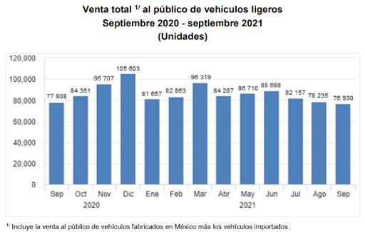 En septiembre se vendieron al público en el mercado interno 76 mil 930 unidades. Por su parte, en el periodo enero-septiembre de 2021 se comercializaron 757 mil 846 vehículos ligeros.