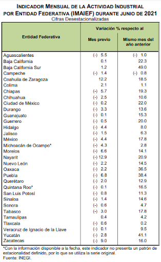 En su comparación anual, las entidades que mostraron los aumentos más significativos en términos reales en su Producción Industrial fueron: Baja California Sur, Yucatán, Puebla, Oaxaca, Baja California, Ciudad de México y Nayarit, con series desestacionalizadas, frente al sexto mes de 2020.