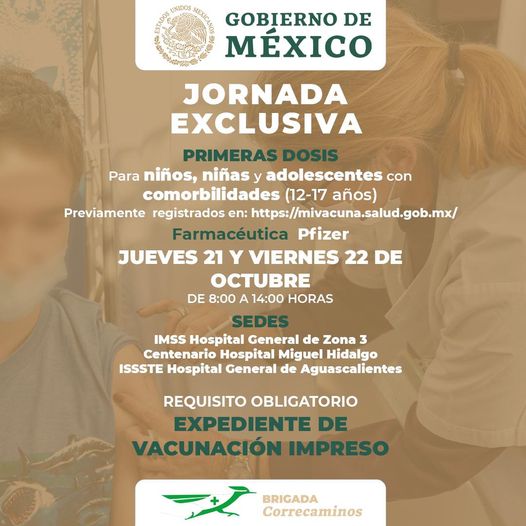 La Delegación de Programas para el Desarrollo de Aguascalientes ha anunciado una jornada de vacunación exclusiva para personas menores de edad de 12 a 17 años que vivan con alguna enfermedad o condición considerada como comorbilidad. Esta se llevará a cabo el jueves 21 y viernes 22 de octubre de 2021.