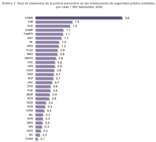 • Sólo hay 0.4 elementos de la policía preventiva en las instituciones de seguridad pública estatales, por cada mil habitantes