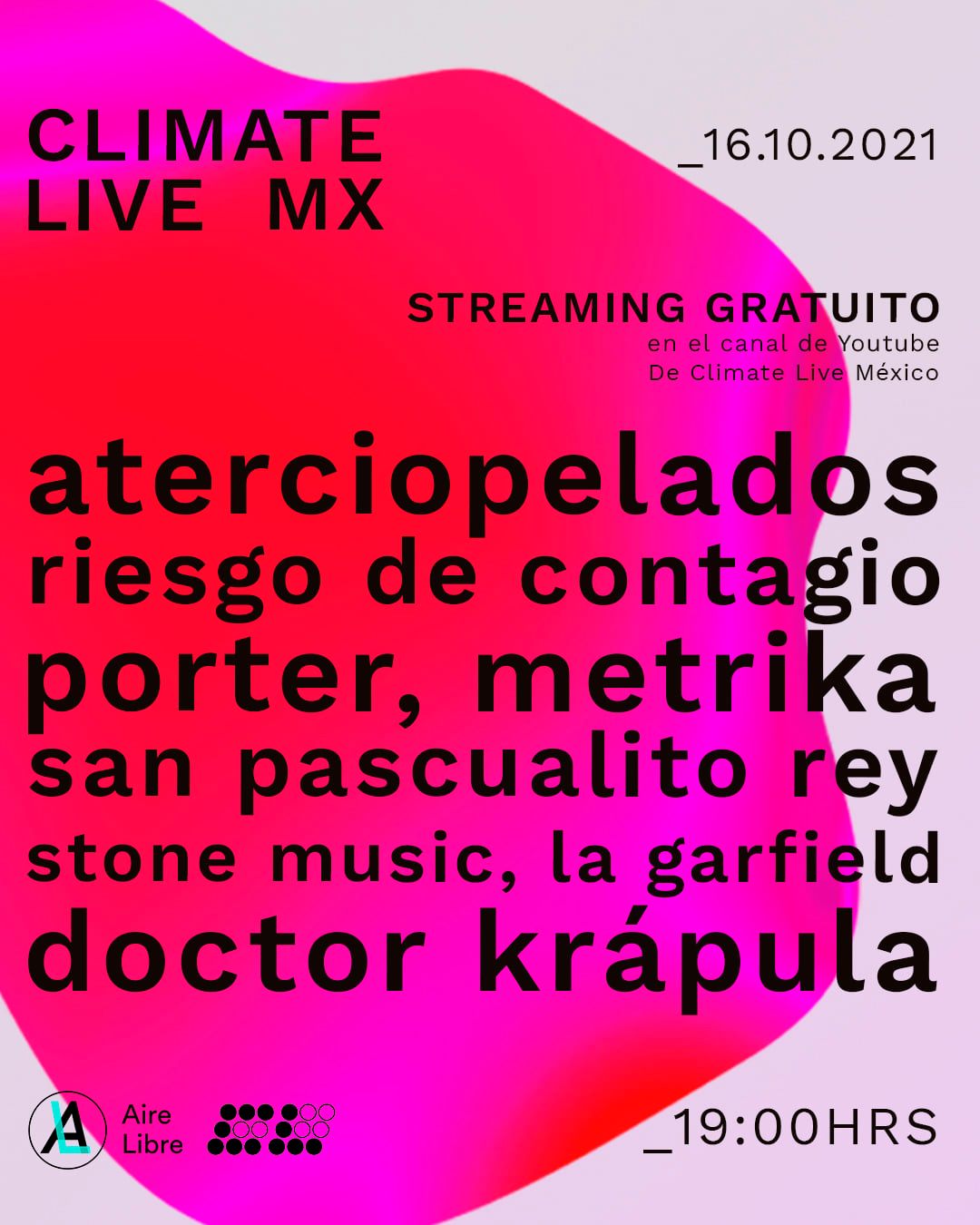 Climate Live MX organiza un concierto virtual que contará con la participación de bandas como Aterciopelados, Porter, San Pascualito Rey, La Garfield, Doctor Krápula, entre otros. Este es el cartel completo de este festival vía remota.