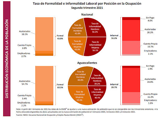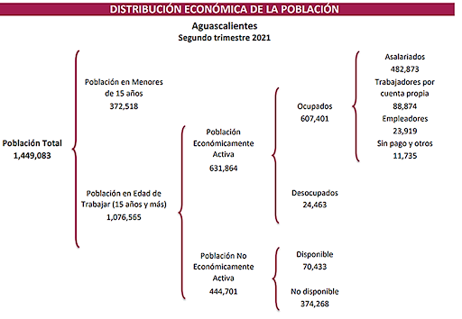 Al segundo trimestre del 2021 Aguascalientes se presenta con 607 mil 401 ocupados, es decir, 22 mil personas más respecto a los datos del primer trimestre del 2021. La economía de Aguascalientes registra ahora 482 mil asalariados y 23 mil 919 empleadores; un promedio de 20 asalariados por cada empleador.