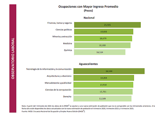 Como ocupaciones con mayor ingreso promedio a nivel nacional se encuentran las relativas a las finanzas, la banca y seguros, seguidas de las ciencias políticas, con salarios entre 21 mil 500 y 19 mil pesos mensuales; le siguen las profesiones relativas a la minería y extractivas con 18 mil 679 pesos y finalmente medicina y química con salarios de 16 mil 500 y 18 mil pesos respectivamente. En Aguascalientes los salarios son menores que en el país.