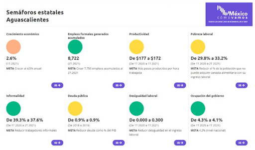 Para el semáforo estatal de México Cómo Vamos, Aguascalientes luce color verde en cuatro de las ocho variables económicas semaforizadas; con tres en amarillo y sólo una con avance tenue: ésta última se refiere al crecimiento económico proyectado en 4.5% y obteniendo hasta ahora un 2.6%, en todo caso superior al 1.5% nacional.