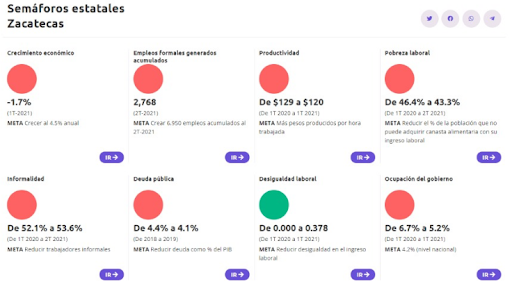 - El semáforo de Zacatecas exhibe siete de ocho indicadores en rojo por uno en verde (ha mejorado la desigualdad laboral) pero presenta un crecimiento económico negativo, baja generación de empleo, con productividad a la baja y una alta informalidad.