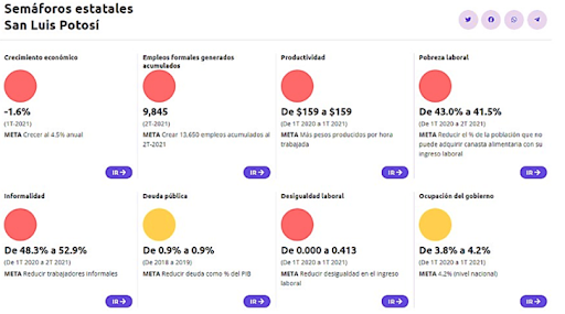 - San Luis Potosí muestra seis de ocho semáforos en rojo por dos en amarillo (la ocupación del gobierno y la deuda pública) Crece en negativo y con alta informalidad mantiene alta pobreza laboral.