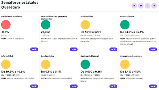 - Querétaro alcanza tres de ocho semáforos en verde por cuatro en amarillo (la productividad laboral, la ocupación del gobierno y la deuda pública) Crece en negativo y con una informalidad del 40%.