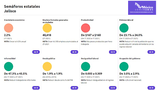 - Jalisco logra cuatro verdes de ocho indicadores. Es un estado que sí está creciendo – al 2.2%-, pero sin alcanzar los empleos formales propuestos y con una baja en la productividad que lo pone en rojo.