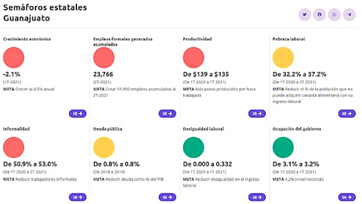 - Guanajuato exhibe cuatro semáforos en color rojo (crecimiento económico, empleos formales generados, productividad e informalidad) sólo dos en verde (desigualdad laboral y ocupación en el gobierno) por dos en amarillo (pobreza laboral y Deuda pública) de ocho semáforos. Guanajuato no crece en positivo y presenta baja productividad.