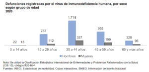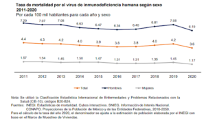 Durante 2020 en México se registraron 4 573 decesos debido a la enfermedad ocasionada por el VIH, de los cuales 3 815 (83%) correspondieron a defunciones en hombres y 758 (17%) en mujeres. La tasa de mortalidad por esta causa es de 3.62 por cada 100 mil habitantes; 6.19 en el caso de los hombres (por cada 100 mil hombres) y 1.17 en las mujeres (por cada 100 mil mujeres). Por grupo de edad, la tasa de mortalidad por VIH más alta se ubica en el grupo de personas de 30 a 44 años y conforme aumenta la edad va disminuyendo la tasa.