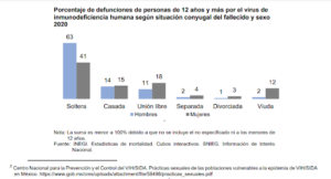Del total de personas fallecidas de 12 años y más (4 542 personas) por el VIH, tanto para el caso de hombres (63%) como el de mujeres (41%) predominan las personas solteras. Le siguen en los hombres los casados (14%) y los que estaban en unión libre (11%). En las mujeres, después de las solteras están las que se declararon en unión libre (18%), las casadas (15%) y las viudas (12%).