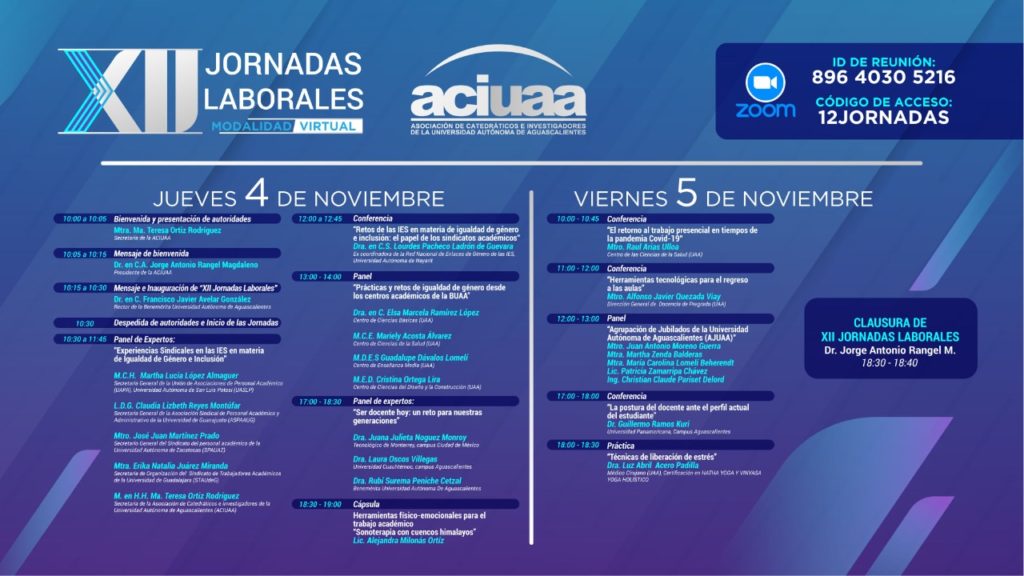De manera digital, comenzaron las XII Jornadas Laborales que organiza la Asociación de Catedráticos e Investigadores de la Universidad Autónoma de Aguascalientes (ACIUAA). El evento, que contempla actividades durante los días 4 y 5 de noviembre, es de acceso libre y cuenta con una amplia oferta de conferencias, paneles, cápsulas y prácticas a cargo de expertos adscritos a la UAA, instituciones del estado y universidades del resto del país.