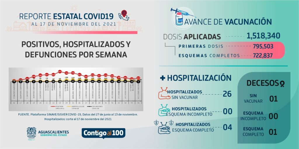 El Instituto de Servicios de la Salud del Estado de Aguascalientes (Issea), dio a conocer en su reporte técnico semanal que se han aplicado hasta este día un total de 1 millón 518 mil 340 dosis de vacuna contra el SARS-Cov-2. En Aguascalientes existen 722 mil 837 personas con su esquema de vacunación completo; mientras que se han aplicado 795 mil 503 primeras dosis. Actualmente hay 26 personas hospitalizadas sin vacunar y cuatro más con su esquema completo; en esta semana se reportaron un total de 2 decesos y 315 casos positivos. Se invita a reforzar las medidas de cuidado durante esta etapa de frío, acudir a vacunarse contra la influenza en caso de ser candidatos y estar atentos a las próximas jornadas de vacunación para completar ambas dosis de la vacuna contra el covid-19.