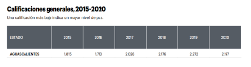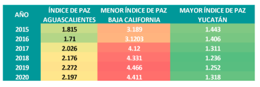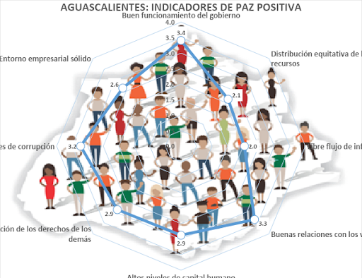 Las lecturas en índice de Paz en Aguascalientes han tenido en promedio una calificación cercana a dos puntos (1.93) Hay estados cercanos al uno y otros que superan al cuatro. La paz en México se encuentra en el 2.694 no es homogénea y más bien presenta múltiples asimetrías.