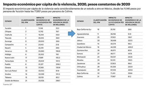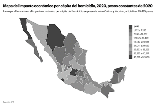 Aguascalientes, que se clasifica en el lugar 11 del IPM 2020, tuvo un impacto económico per cápita por 36,158 pesos y un costo por concepto de violencia por 51.9 (miles de millones)