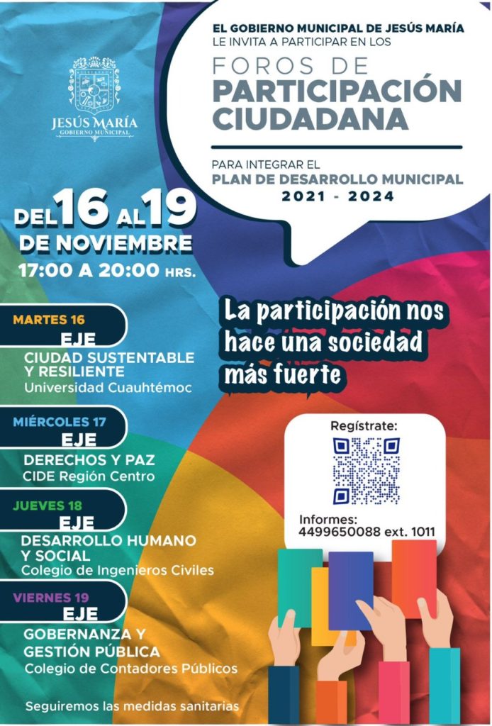 Con el fin de fomentar la participación democrática, el Municipio de Jesús María invita a la población en general a tomar parte en los Foros de Participación Ciudadana para la construcción del Plan de Desarrollo Municipal de Jesús María 2021-2024, los cuales se llevarán a cabo del 16 al 19 de noviembre.
