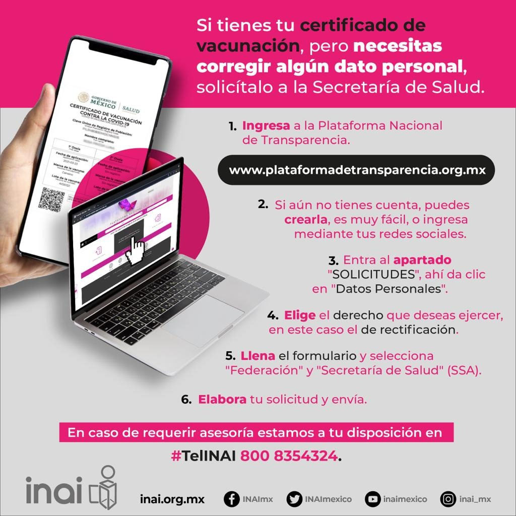 El Instituto Nacional de Transparencia, Acceso a la Información y Protección de Datos Personales (INAI) llamó a los ciudadanos que hayan detectado algún error en los datos personales de su certificado de vacunación contra el covid-19, a solicitar su corrección a la Secretaría de Salud.