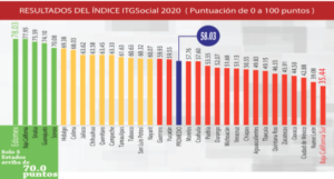 En la evaluación reciente del ITG-Social, en el nivel alto estuvieron en total cinco entidades; el Estado de México se colocó en la primera posición, con 78.03 puntos, seguido de Baja California (77.95), Sonora (75.59) Guanajuato y Sonora, con 74.10 y 70.08 puntos, respectivamente.